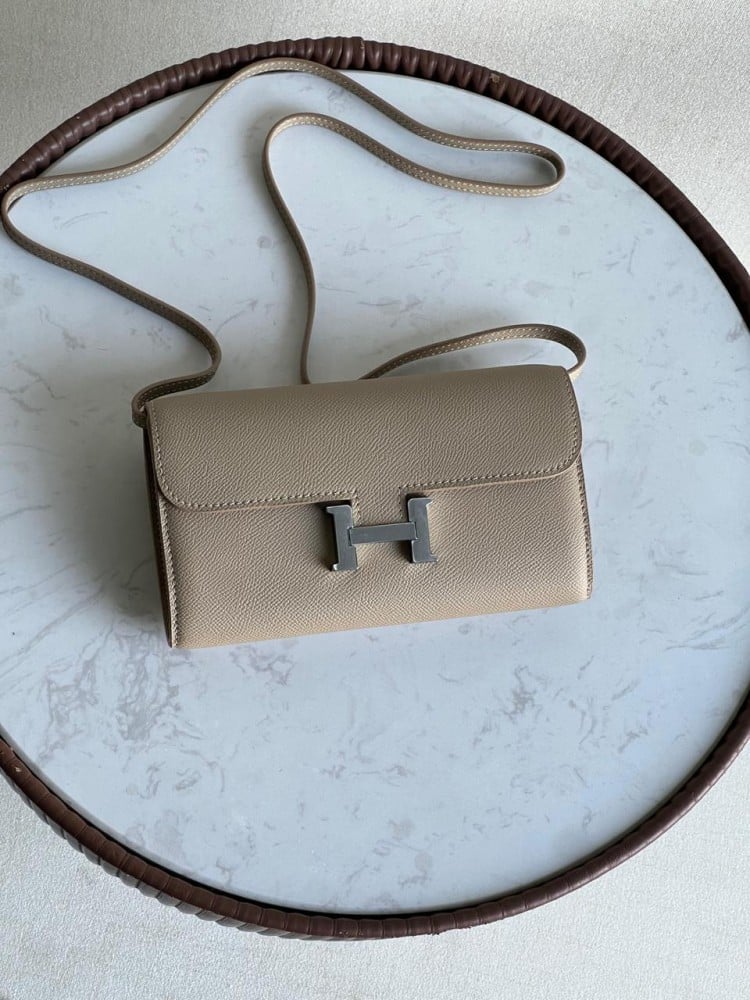 شنتة للكتف نسائية هيرميس كونستانس Hermès Constance بلونها البيج مع حزام طويل وشعار هيرميس الفضي تمثل قطعة أنيقة وفاخرة، تضفي لمسة من الرفاهية على إطلالتك.