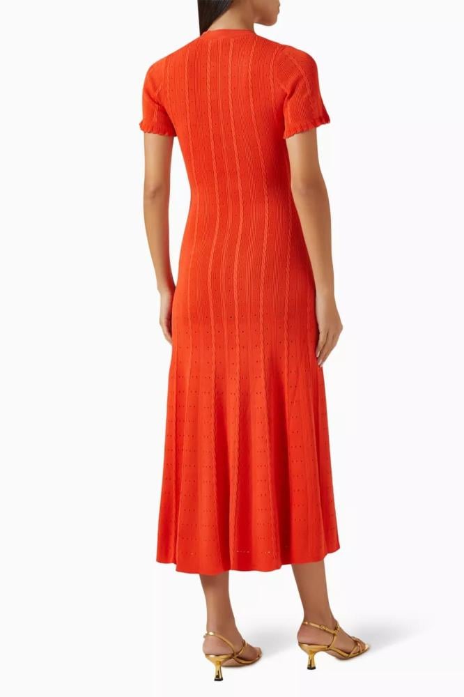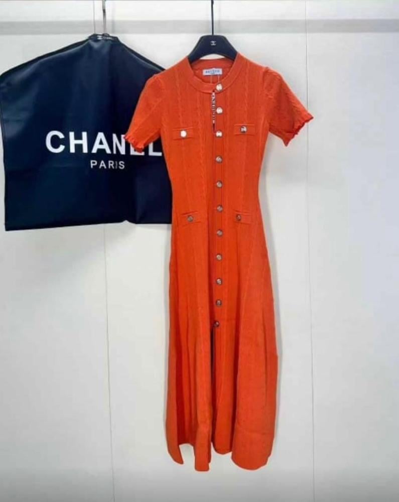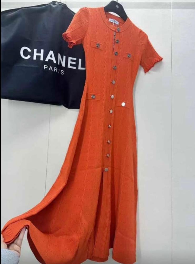 يأتي هذا الفستان بلونه البرتقالي النابض بالحياة ليمنحك حضورًا مشرقًا وأنيقًا في كل مناسبة. تم نسجه بعناية من خامة عالية الجودة ذات ملمس ناعم ومظهر محبوك يضفي لمسة فنية على التصميم. يتميز بقصة انسيابية تبدأ من صدرٍ مُحكم وتنسدل برقة نحو الأسفل، مما يبرز جمال القوام دون تكلّف.