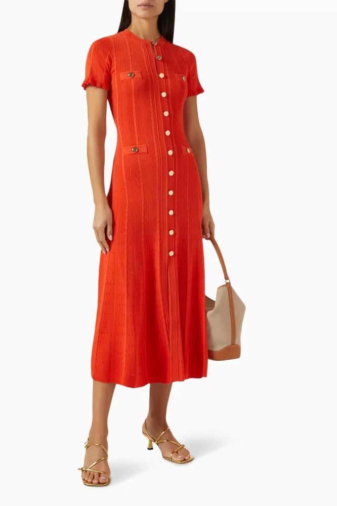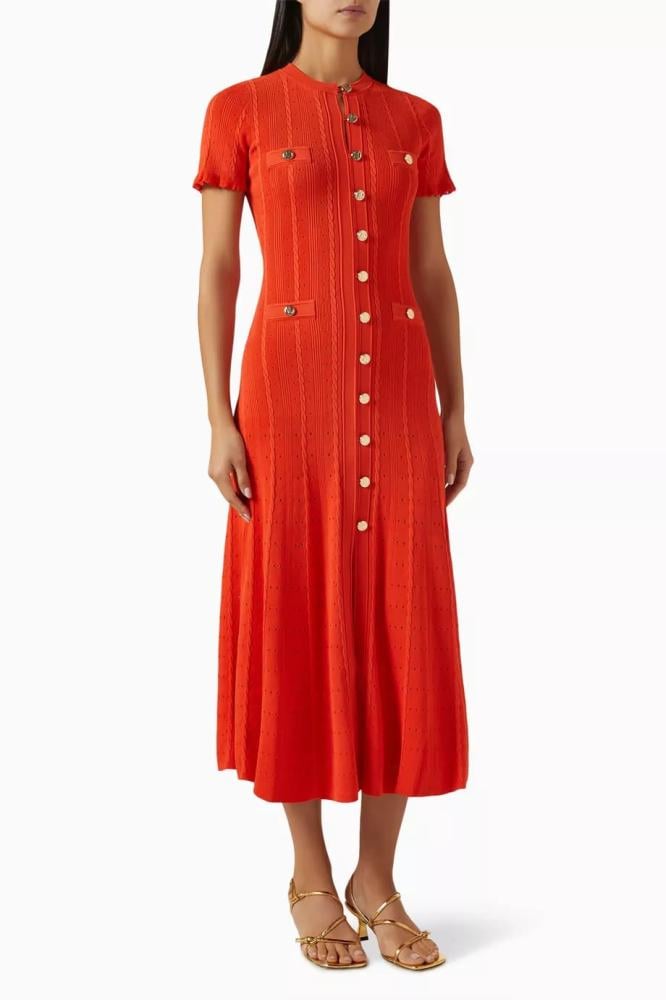 فستان منسوج ساندرو بأكمام قصيرة وأزرار أمامية – برتقالي من متجر Eseven store