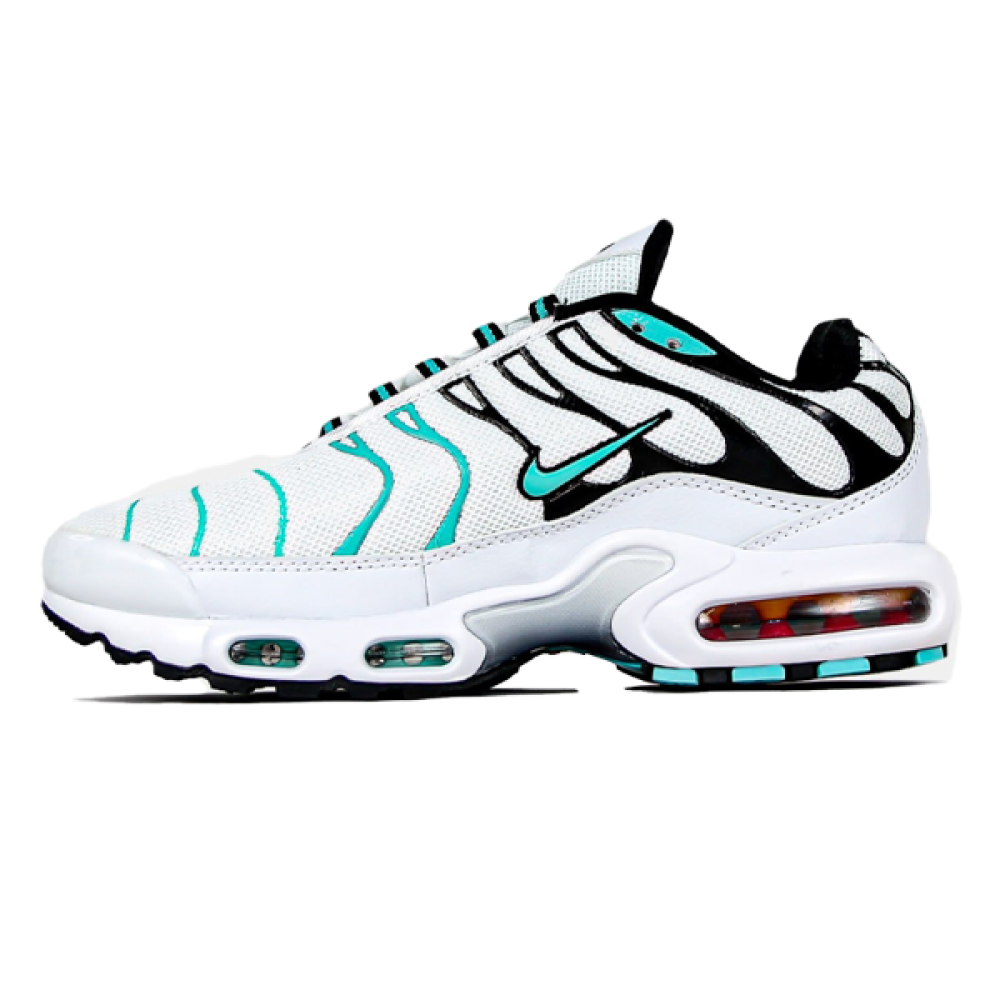 Experience a unique combination of comfort and style with the Nike Air Max Plus men's shoe , featuring a sleek design in crisp white and refreshing aqua accents.