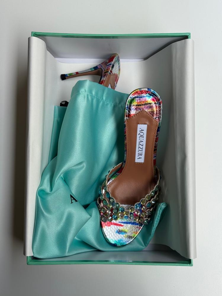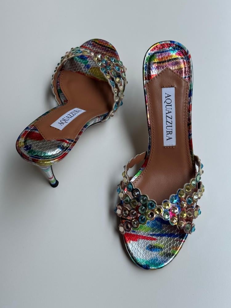 شبشب كعب عالي اكوازورا طبعة جلد افعى ملونة مزين بكريستال