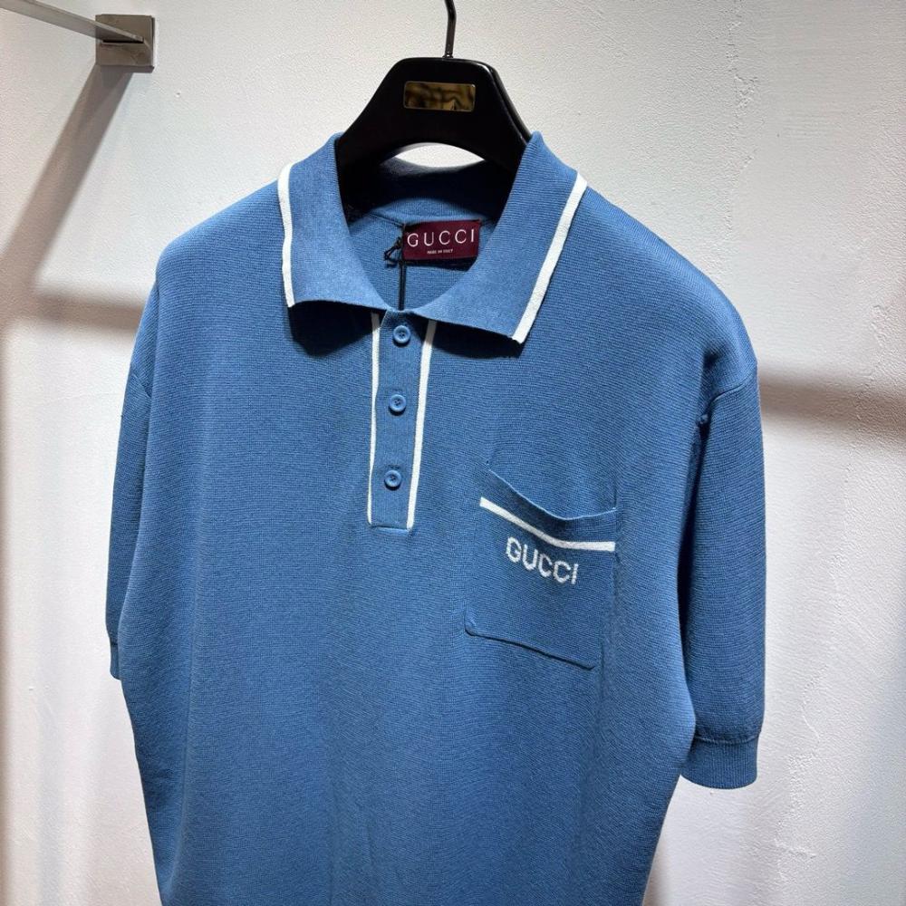 بولو تيشيرت رجالي من جوتشي بلون أزرق وخطوط بيضاء – اشعر بالراحة والرفاهية في كل لحظة