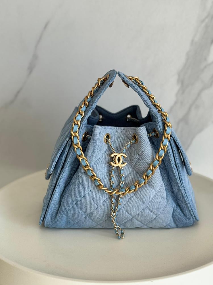 شنطة دينيم شانيل 25سم بلون ازرق فاتح وسلسلة ذهبية