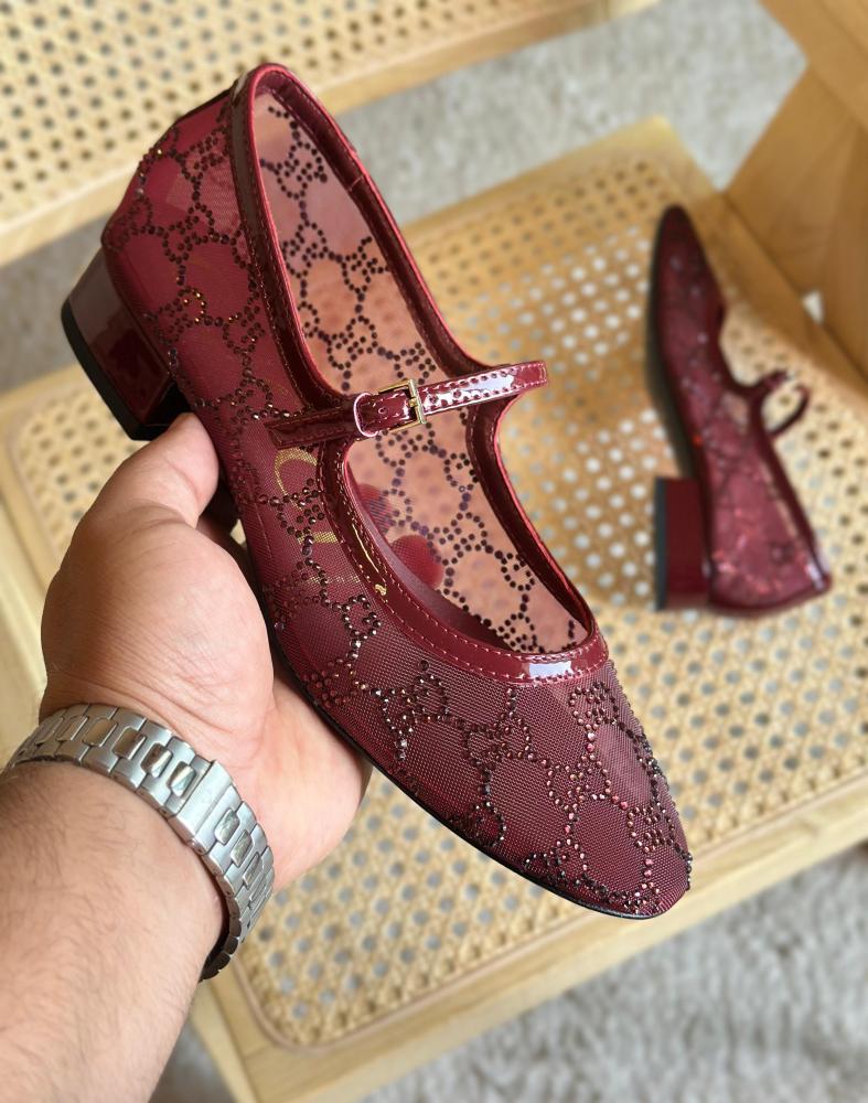 حذاء جوتشي النسائي بكعب متوسط يجمع بين الراحة والأناقة، مصنوع من خامة شبكية راقية بلون خمري أنثوي ومزين بستراس برّاق ليمنحك حضوراً لافتاً في المناسبات والسهرات.