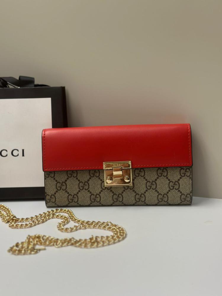 محفظه طويلة جوتشي بادلوك GG بسلسلة احمر وبني