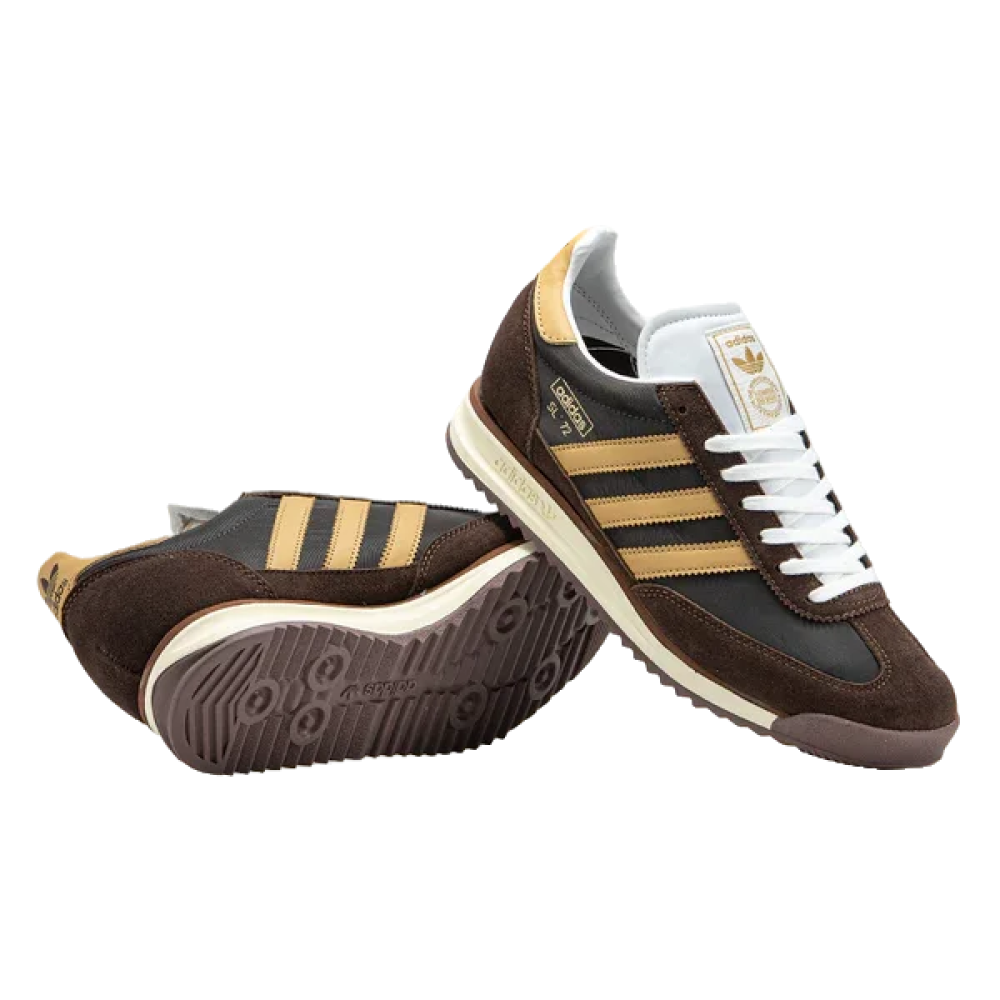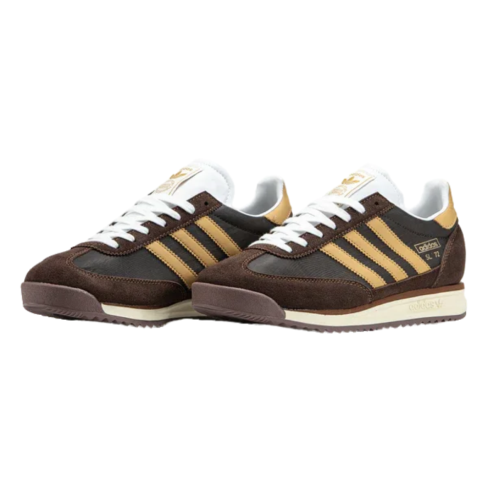 خفة وأناقة مع حذاء أديداس SL72 RS بلونه البني الزيتي وخطوطه الصفراء الكلاسيكية