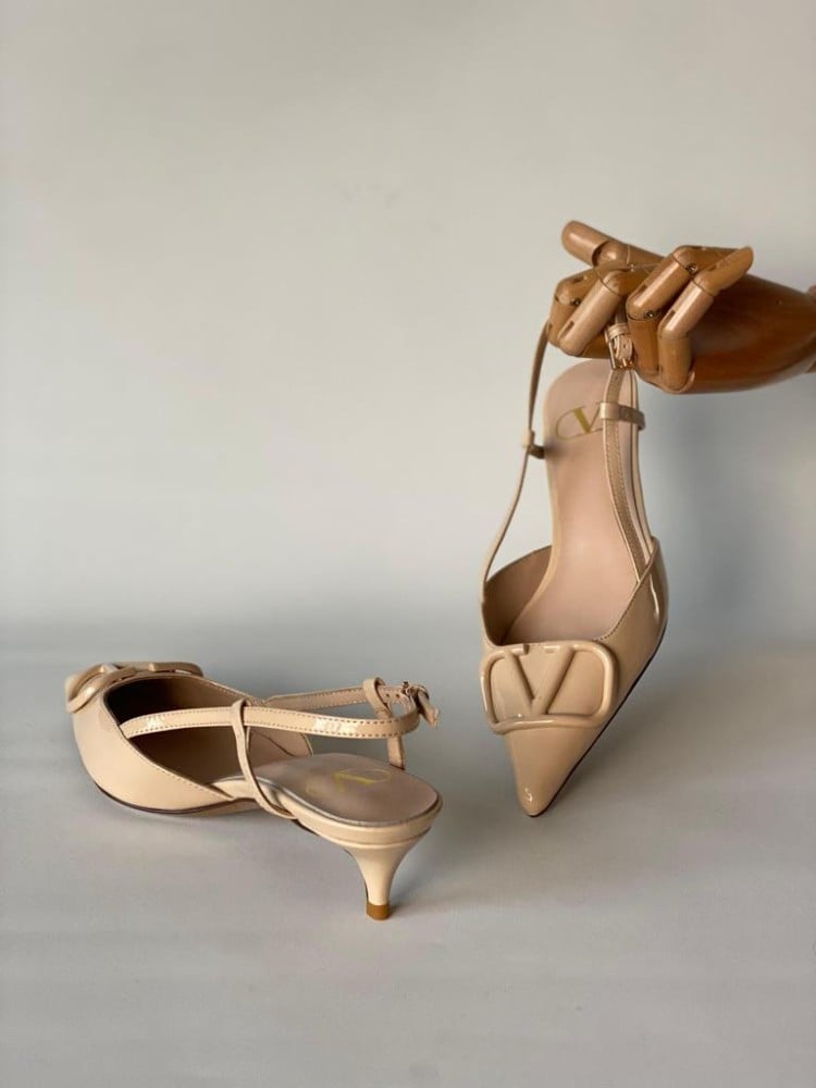 يتميز الجزء العلوي لكلاش فالنتينو المغلق بلون بيج فاتح يعزز من جاذبيته ويتناسب مع معظم الإطلالات بفضل كعبه المنخفض. يتميز الجزء الأمامي بتصميم متقن وأنيق يضفي لمسة فاخرة على الحذاء. كما يتميز بقفل خلفي يضمن الثبات والراحة أثناء ارتدائه.