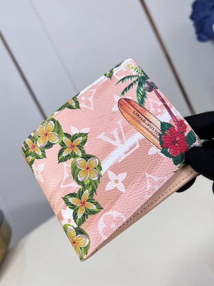 محفظة لويس فيتون النسائية بلون زهري أنيق وطبعة أزهار مميزة، تجمع بين الفخامة والأناقة في تصميم واحد.