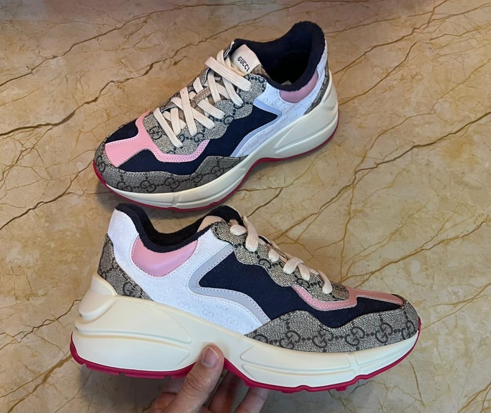 شوز قوتشي رايثون باللون الرمادي مع تفاصيل ملتي كلر ونقشة GG الشهيرة هو الخيار الأمثل للنساء اللواتي يبحثن عن الأناقة الإيطالية بلمسة جريئة ومميزة.
