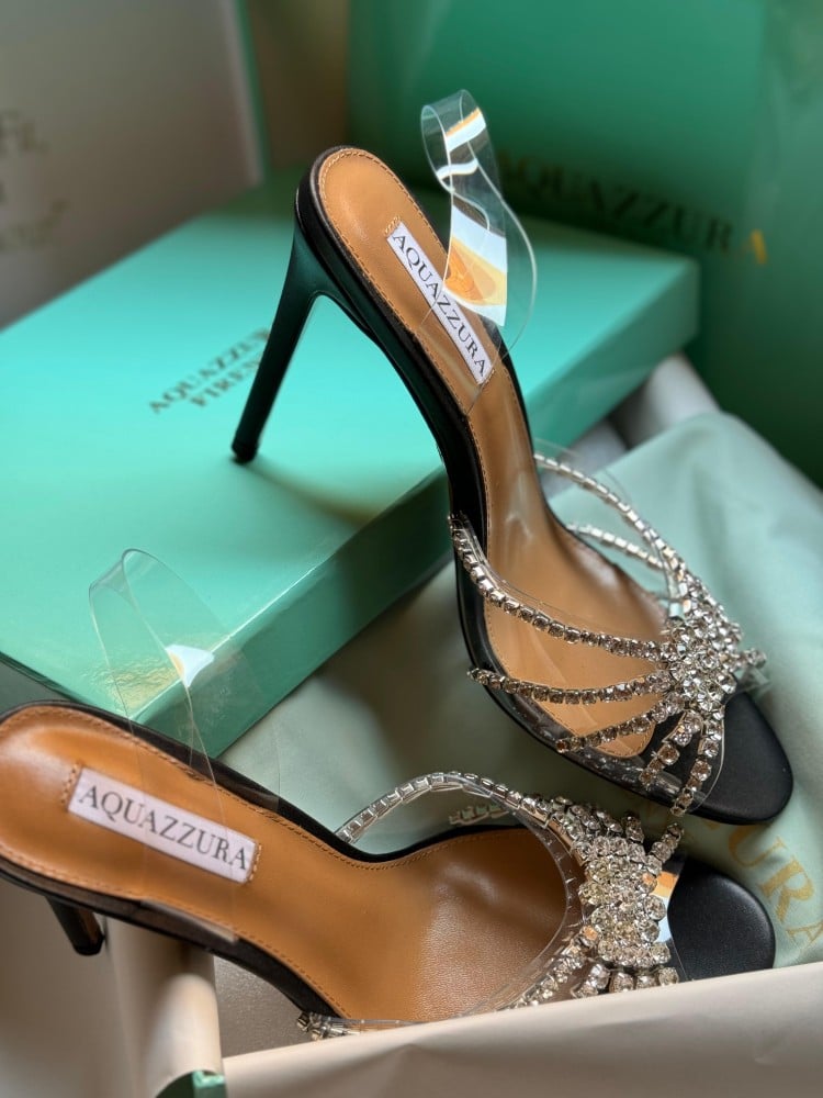 صندل نسائي من إكوازورا بكعب مرصع بالكريستال ولون أسود فاخر هو رمز للأناقة والتميز، مما يجعله الخيار المثالي للمناسبات الراقية.