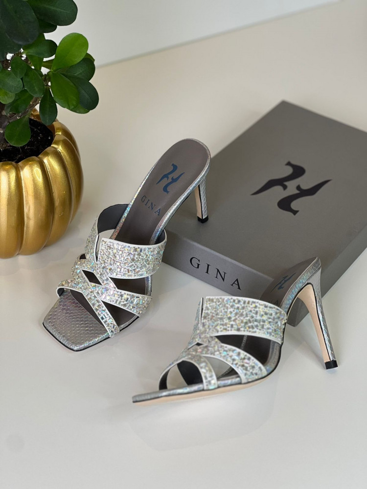 صندل نسائي من جينا بلون فضي مميز لامع وكعب عالي