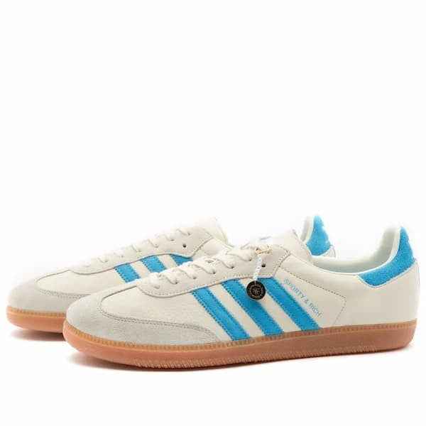 استمتع بالأناقة والراحة مع حذاء اديداس سامبا (Adidas Samba) بتصميم "سبورتي آند ريتش" (Sporty & Rich) المميز، الذي يأتي بألوان كريمية مع لمسات من الأزرق. هذا الحذاء يجمع بين الأسلوب الكلاسيكي واللمسات العصرية، ليمنحك إطلالة رياضية أنيقة.