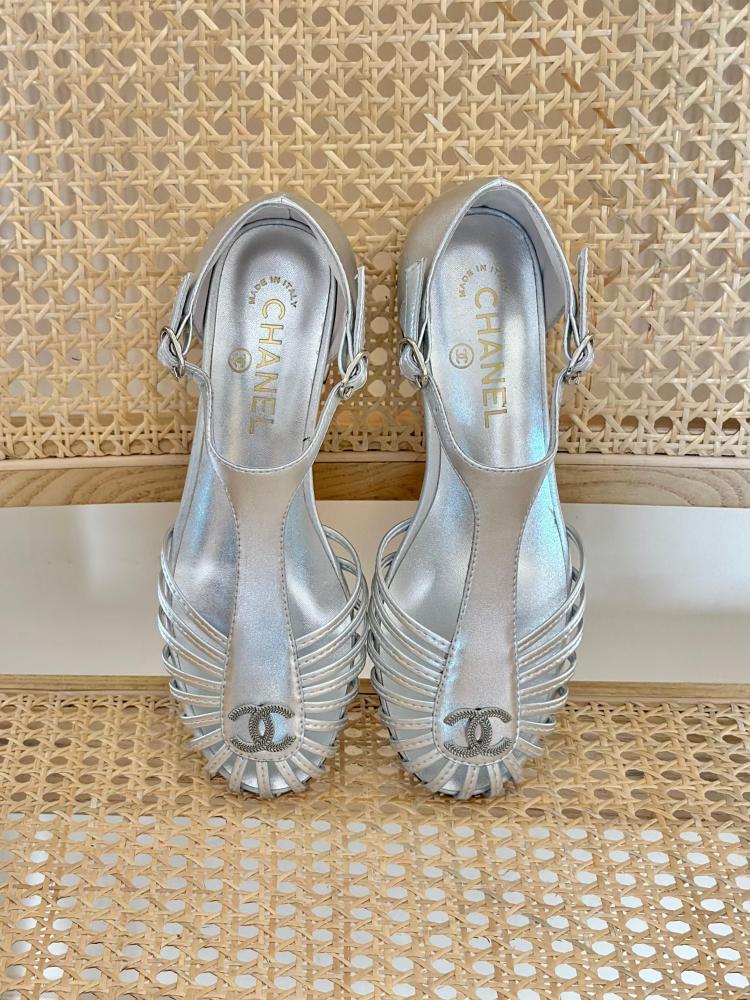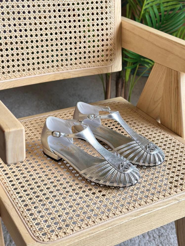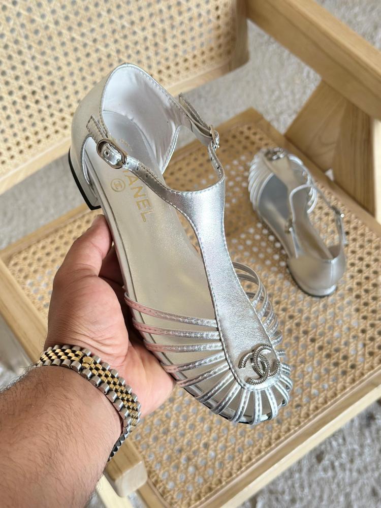 صندل شانيل بتصميم روماني لون فضي بشعار الماركة