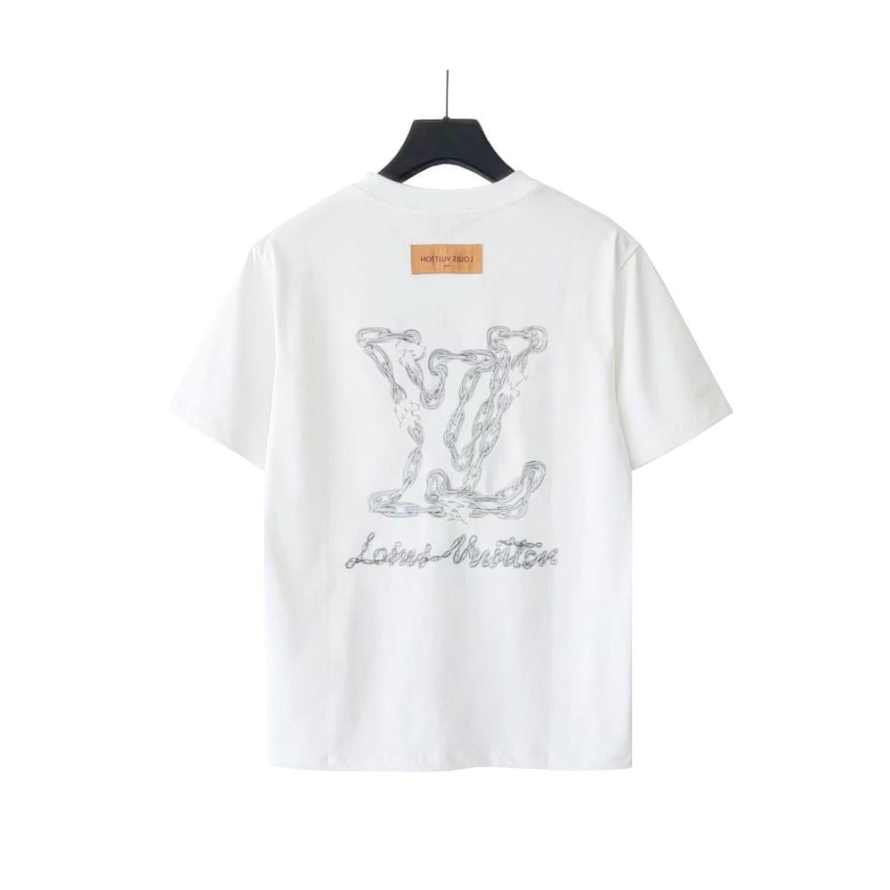 تلهمك البساطة وتفرض حضورك — تي شيرت لويس فيتون الأبيض المطرز يخلّي أناقة الرجل العصري واضحة من النظرة الأولى.