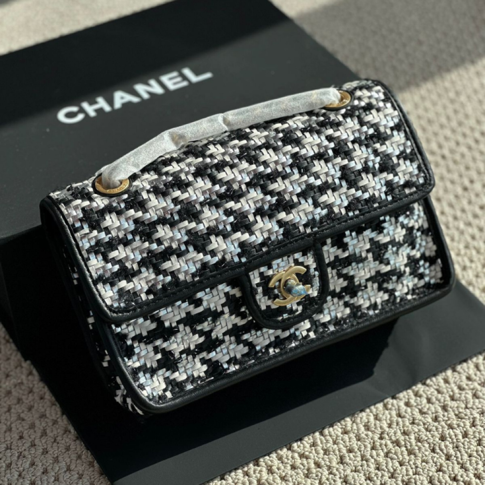 اكتشفي الجمال الكلاسيكي الممزوج بلمسة عصرية مع حقيبة “شانيل فلاب زيج زاج بلاك اند وايت”. تتميز هذه الحقيبة بتصميم الغطاء الأيقوني ونمط الزيج زاج الذي يجمع بين الأسود والأبيض، مع إبراز شعار شانيل الشهير على القفل.