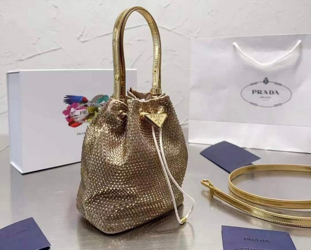 حقيبة يد برادا ذهبية ساتان مع ستراس – تصميم فاخر مع مقبض مريح