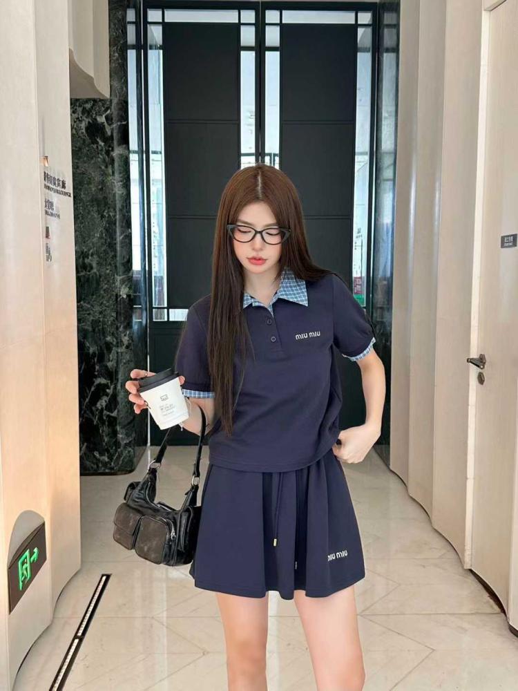 إطلالة سبورت أنثوية عصرية مع طقم ميوميو – تنورة قصيرة وتيشرت بألوان أزرق وكحلي!