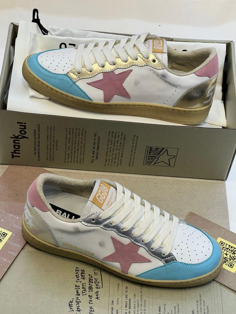 يتميز السنيكر بجزء علوي من مزيج الجلد والقماش، مما يضمن متانة وتهوية ممتازة. الألوان الباستيل المستخدمة، مثل الوردي الفاتح، الأزرق السماوي، والأصفر الليموني، تضفي على الحذاء طابعًا شبابيًا ومنعشًا يناسب فصول الربيع والصيف. تصميم الحذاء يشمل تفاصيل دقيقة مثل الخياطة الراقية والشعار النموذجي لجولدن جوس، مما يبرز الحرفية الإيطالية الفاخرة.