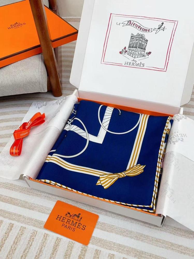 الأناقة الفاخرة مع سكارف هيرميس إيبرون بندانة رأس المصمم بنقوش صيفية دافئة وألوان بلو نايت العميقة. هذا السكارف المربع، مع تصميمه الفريد والراقي، يُعد الخيار المثالي لإكمال إطلالتك بأناقة استثنائية.