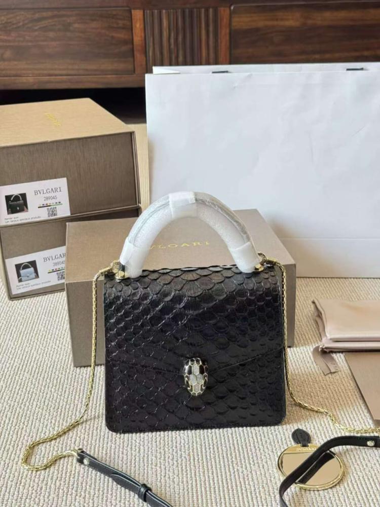 شنطه بولغاري قلاب جلد نقشة أفعى لون أسود بمقبض وسلسلة