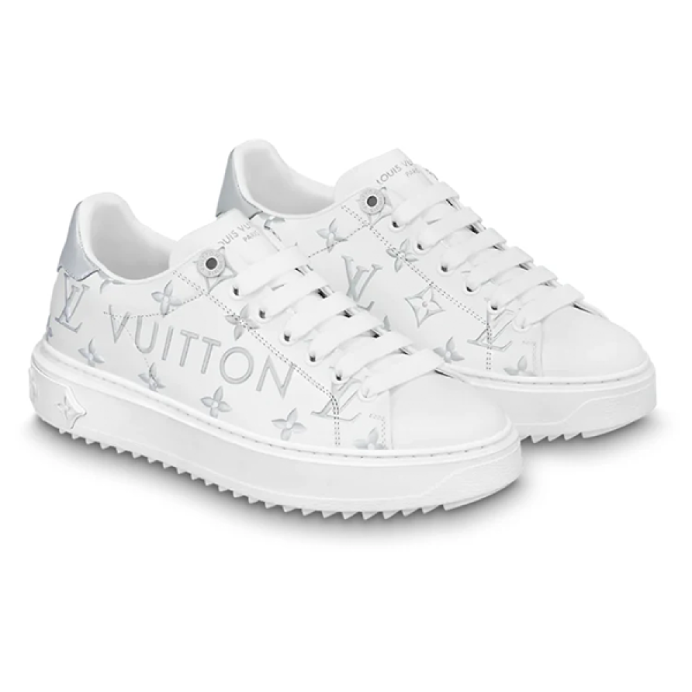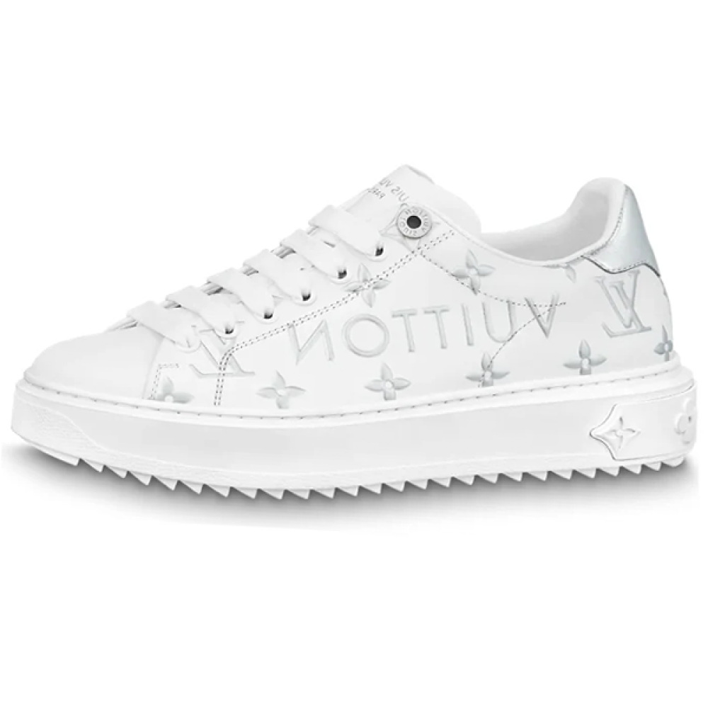 سنيكر لويس فيتون تايم أوت للجنسين باللون الأبيض والفضي مونوغرام بحروف الماركة يجمع بين الفخامة الكلاسيكية والتصميم الرياضي العصري.