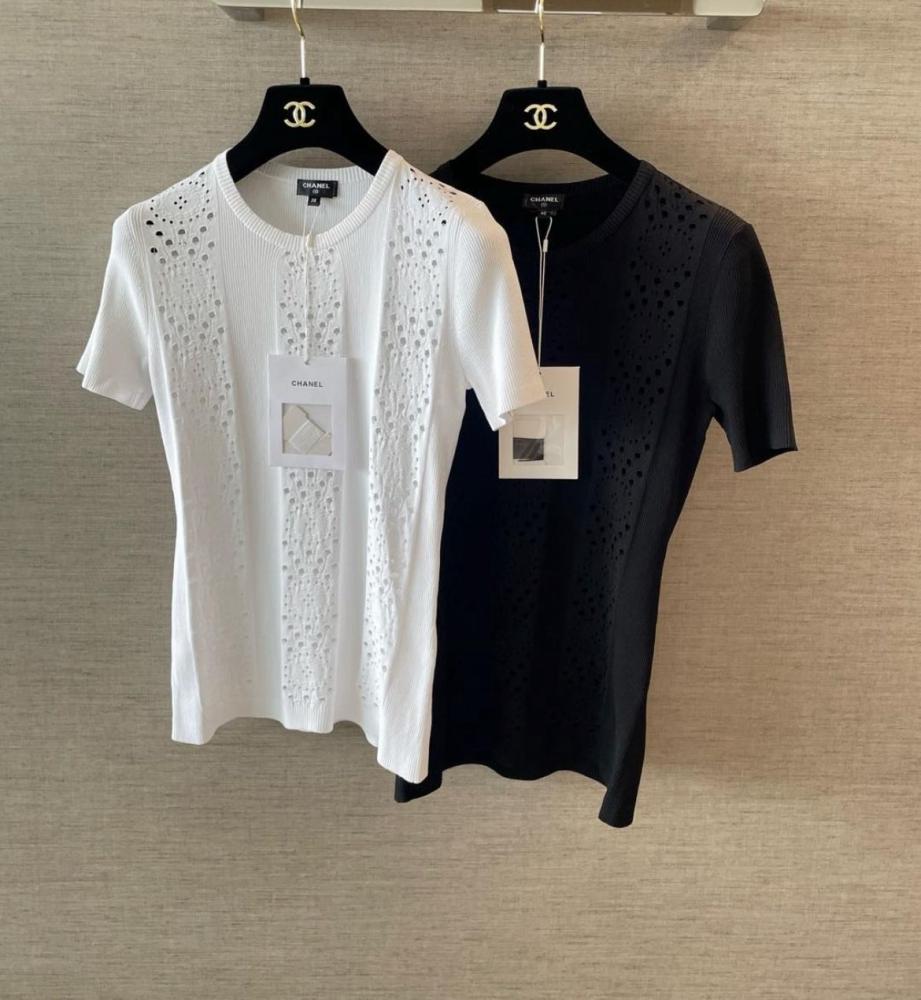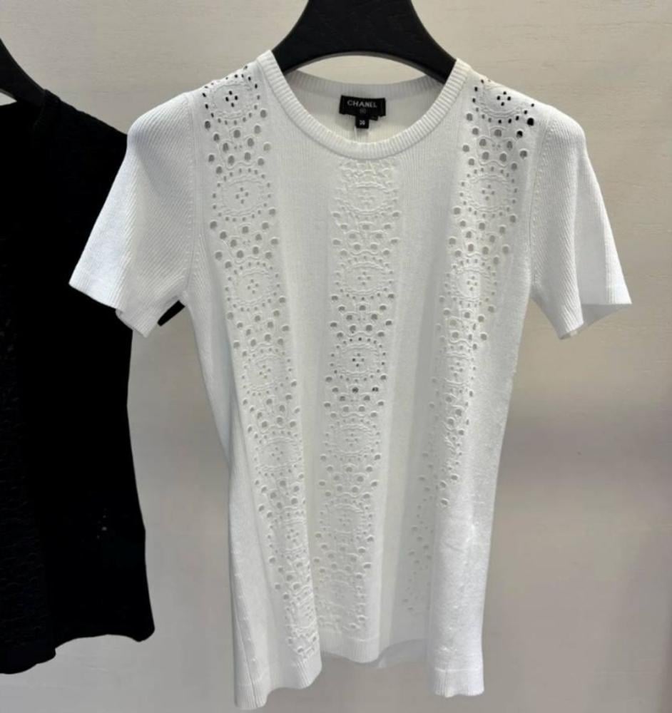 ارتقي بإطلالتك إلى مستوى جديد من الأناقة مع تيشيرت شانيل النسائي المفرغ باللون الأبيض، قطعة تجمع بين الفخامة والراحة في آنٍ واحد.