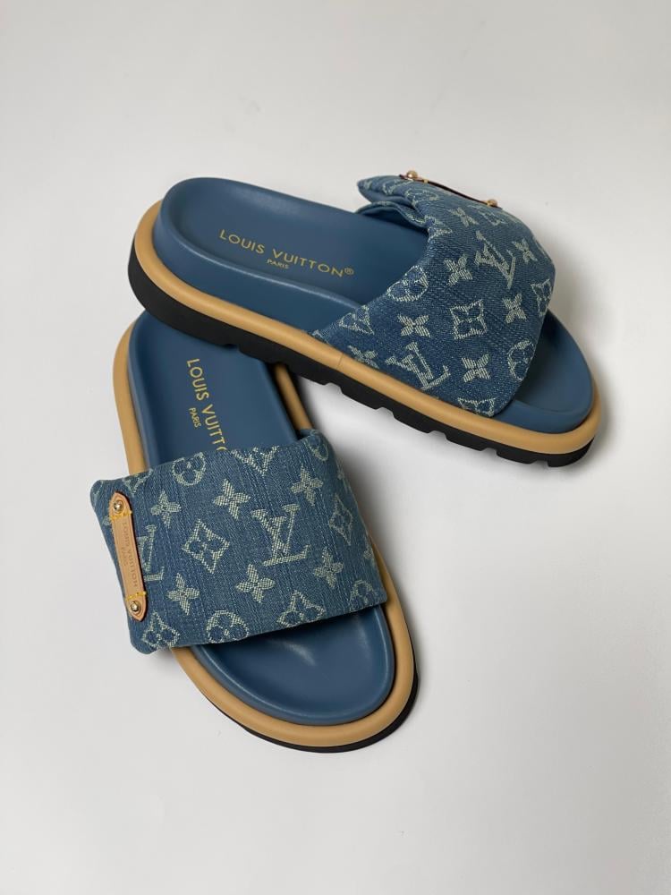 مصنوع من الدينيم الفاخر، يقدم هذا السليبر تجربة مريحة للقدمين مع مرونة ونعومة لا تضاهى. اللون الأزرق العميق يوفر قاعدة مثالية لشعارات لويس فيتون المنتشرة بأناقة، مما يعكس التراث الغني والحرفية المتقنة للعلامة التجارية.
