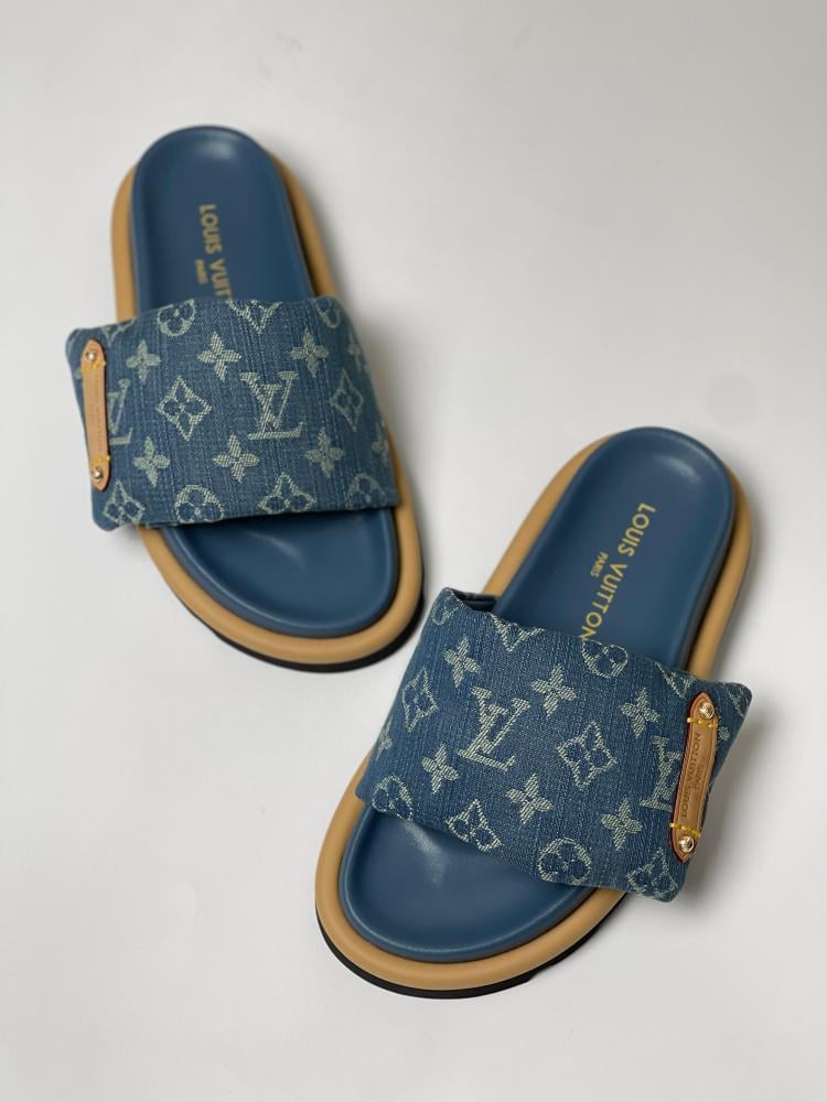 استمتعي بالأناقة العملية والمريحة مع سليبر دينيم فلات النسائي من لويس فيتون، المصمم باللون الأزرق الجذاب ومزين بشعارات الماركة المميزة.