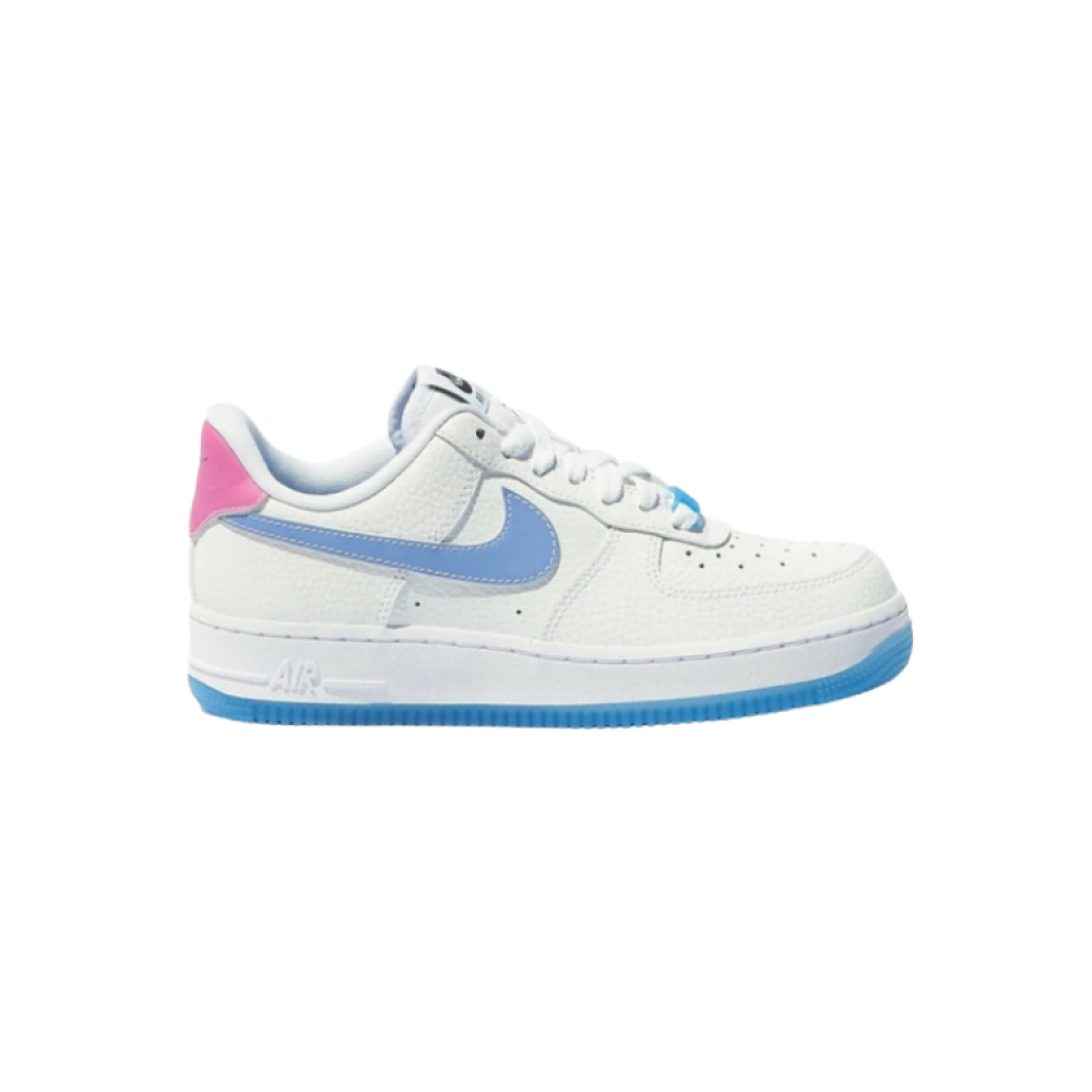 يتغير لونه تحت ضوء الأشعة فوق البنفسجية. اعتمادًا على الظروف البيئية ومستويات الأشعة فوق البنفسجية ، لن يتغير لون الحذاء بعد 8 ساعات تقريبًا ، مما يجعل النتيجة النهائية فريدة لكل زوج. يتحول اللون من الأبيض مع تفاصيل زرقاء جليدية ، مضيفًا "الأزرق الجامعي" والأحمر بينما يظل اللسان والأربطة والبطانات