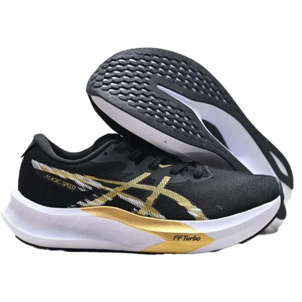 ارتقِ بتجربة الجري الخاصة بك مع حذاء ASICS ماجيك سبيد بلاك جولد للرجال، المصمم لأولئك الذين يسعون للسرعة والأناقة. يتميز هذا الحذاء عالي الأداء بتقنية FF Turbo في النعل الأوسط، مما يوفر لك دفعة إضافية لدفعك للأمام. الجزء العلوي الأسود الأنيق مزين بتفاصيل ذهبية جريئة، مع نقش “MAGIC SPEED” الذي يجسد الأناقة والسرعة.