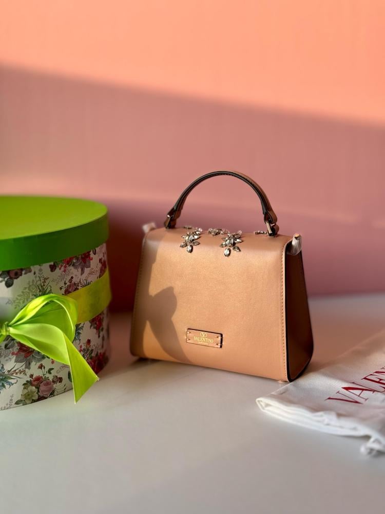 حقيبة مرصعة بالكريستال فالنتينو v لوغو لون دارك بيج