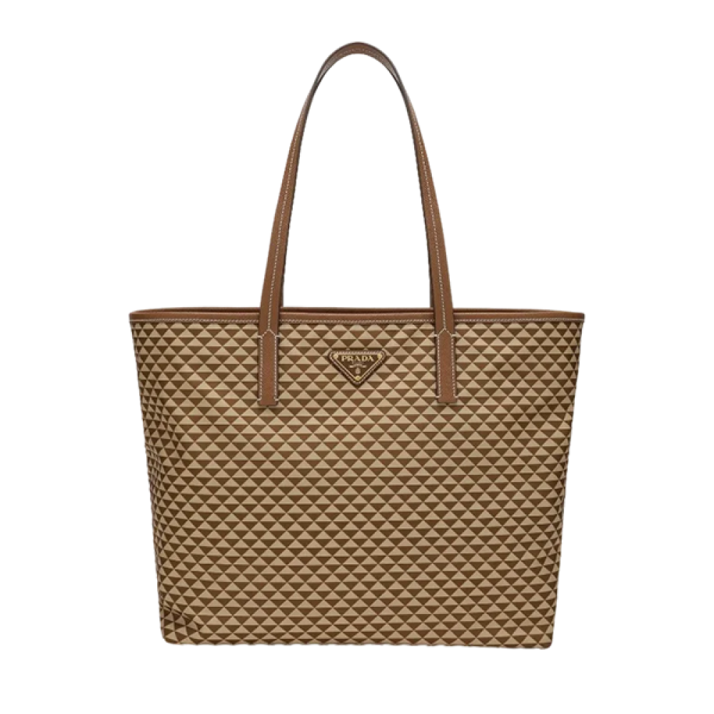 شنطة يد برادا Re-Nylon بلون كراميل دافئ ومقابض متينة، تجمع بين الفخامة والعملية مع شعار الماركة المميز.