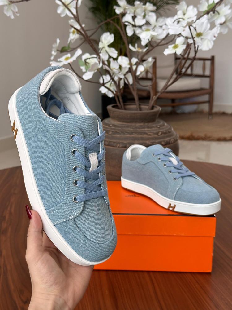 الانتعاش والأناقة لإطلالتك مع سنيكر هيرميز النسائي بأربطة بلونه الأزرق الفاتح الأنيق.