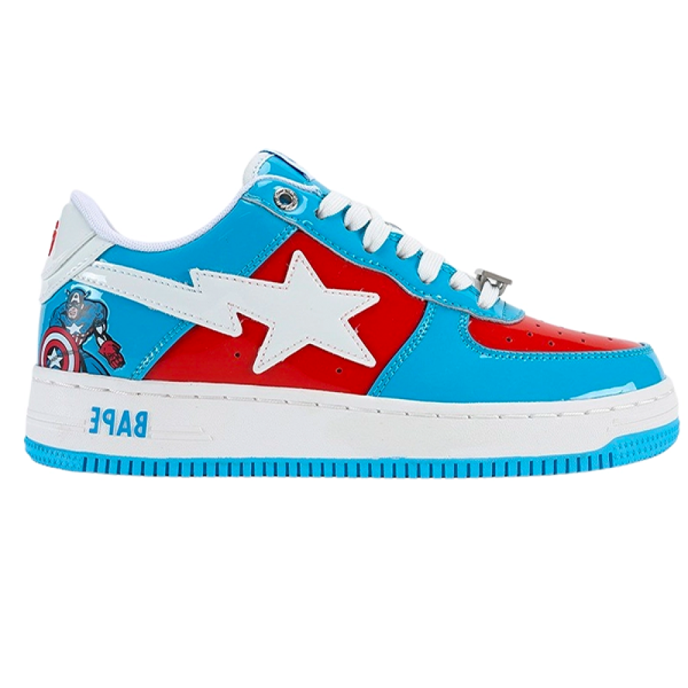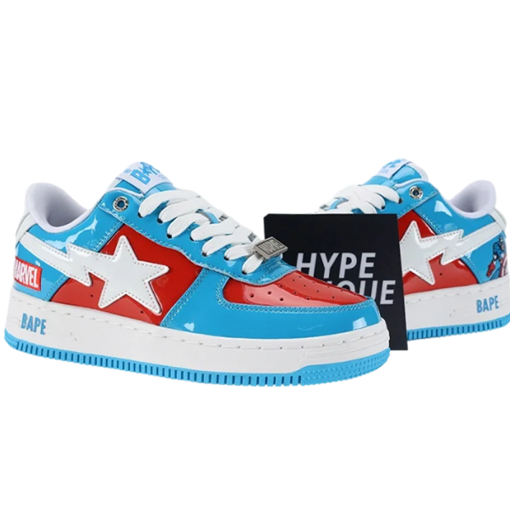 شوز Marvel × BAPE يأتي بتصميم لامع أزرق وأحمر مستوحى من عالم مارفل، ليمنحك إطلالة جريئة وشبابية مع لمسة فريدة من أسلوب BAPE العصري.