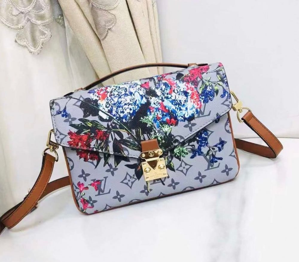 حقيبة لويس فيتون لون رمادي مع طبعات العلامة وأزهار ملونة لامعة