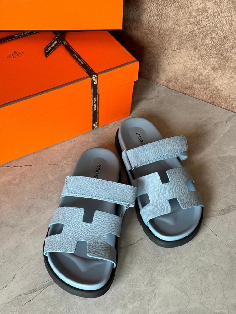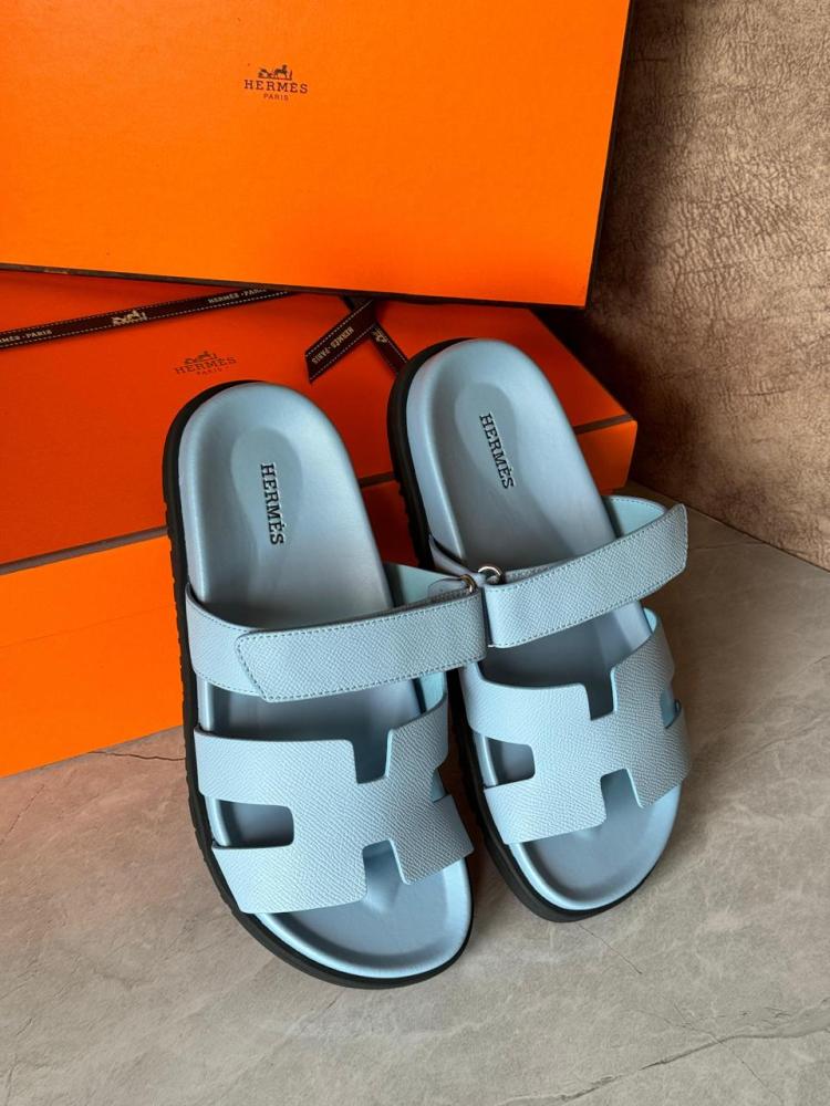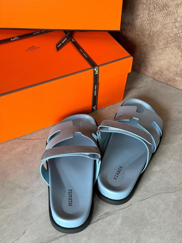 استمتعي بالأناقة البسيطة والراحة الفائقة مع شبشب نسائي بدون كعب من هيرميس بتصميم شايبر، بلون لايت بيبي بلو الرقيق.