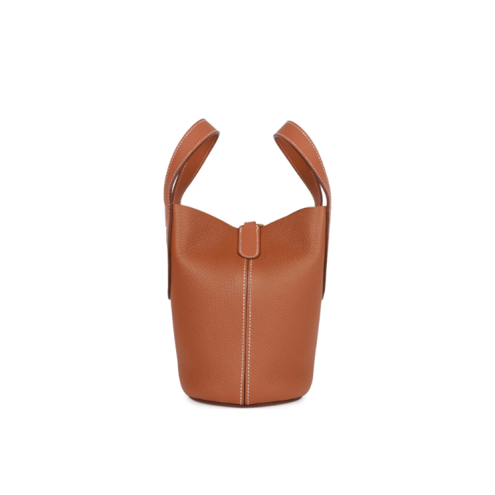 هذا الجلد السريع مع قطع من البلاديوم وله خياطة متباينة بمقبضين علويين. الداخل مبطّن بالجلد الطبيعي ، مع جيب واحد منزلق ومشبك علوي للإغلاق.