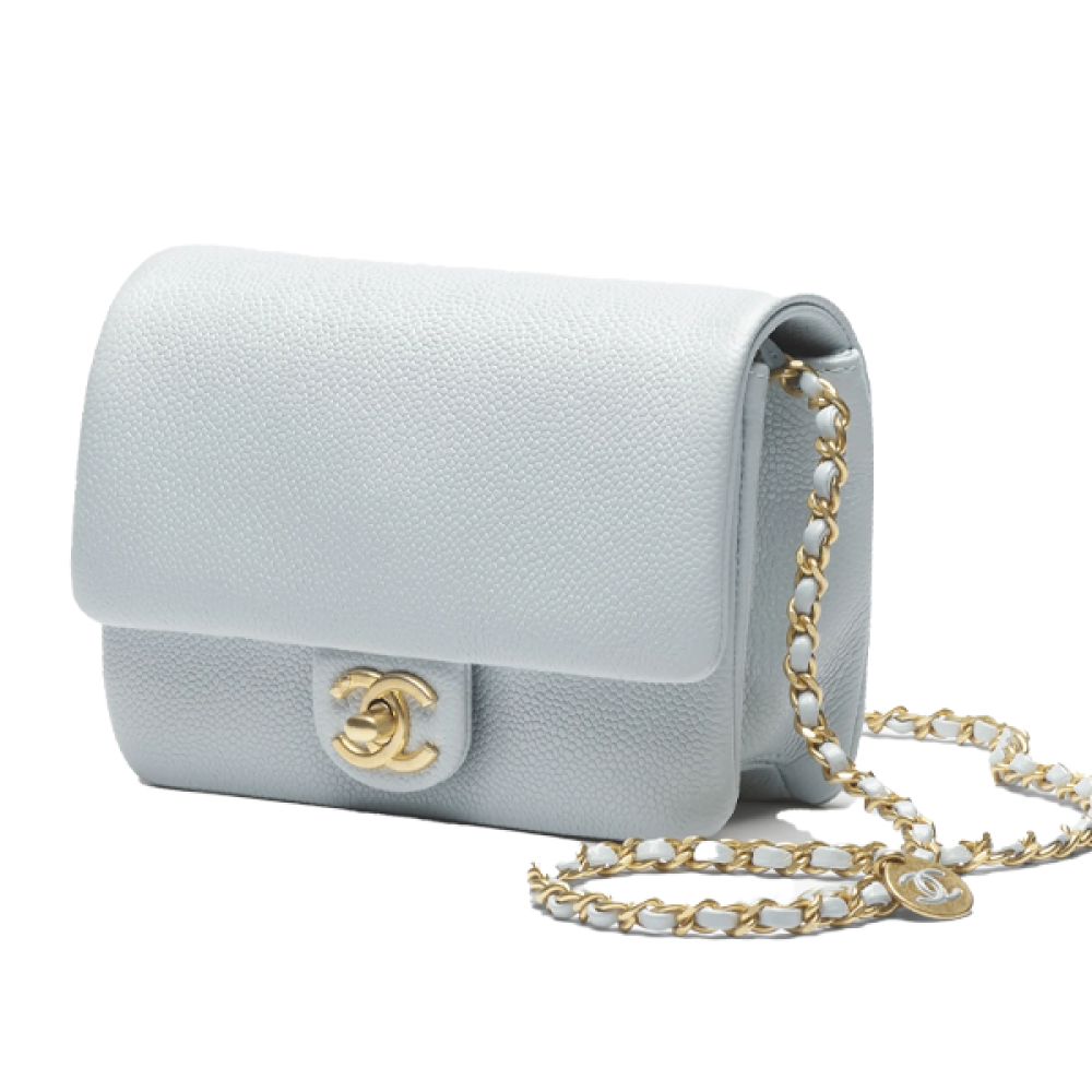 شنطه صغيره شانيل 17سم بقلاب أنيقة لون أزرق سماوي بمعدن ذهبي
