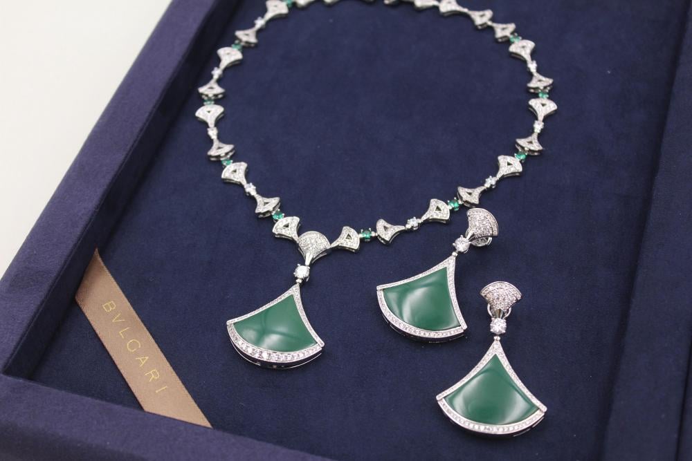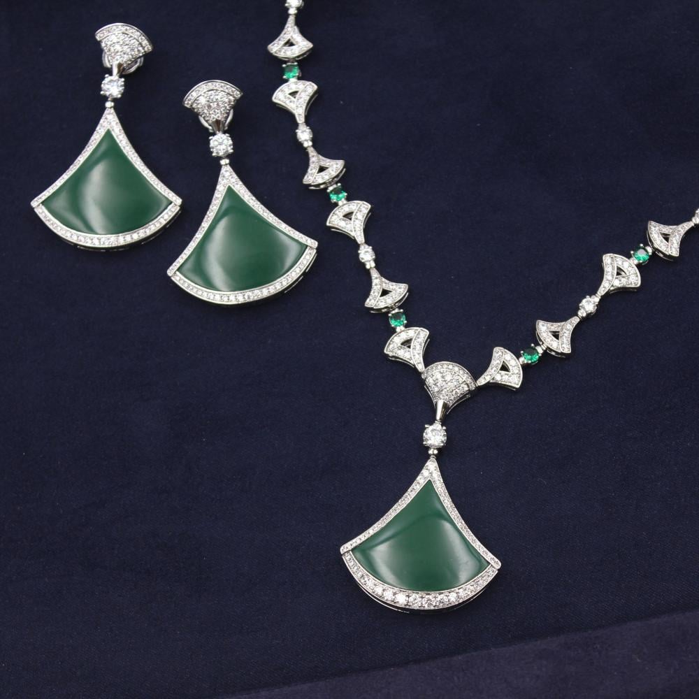 طقم مجوهرات من بولغاري عقد وحلق فضي وحجر أخضر