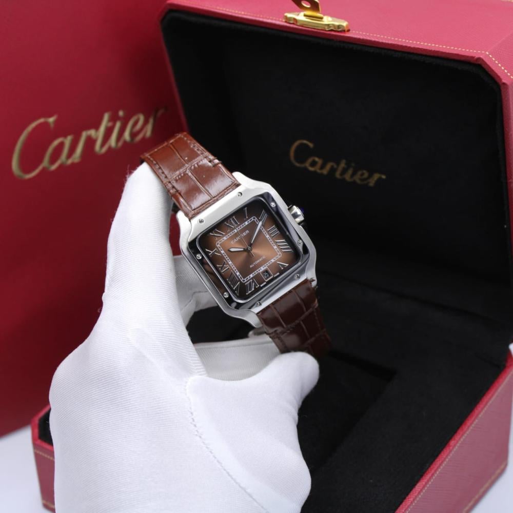 لمسة من الأناقة الكلاسيكية – ساعة سانتوس دو كارتييه الرجالية بإطار مربع ومينا بني