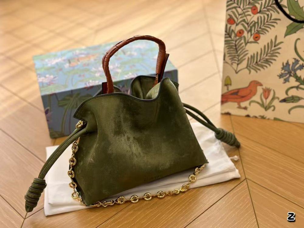 أكملي إطلالتك بلمسة من الفخامة مع حقيبة Loewe الشامواه باللون الأخضر الملكي.