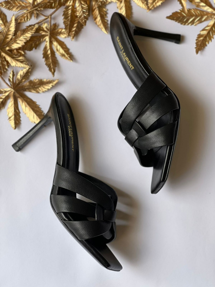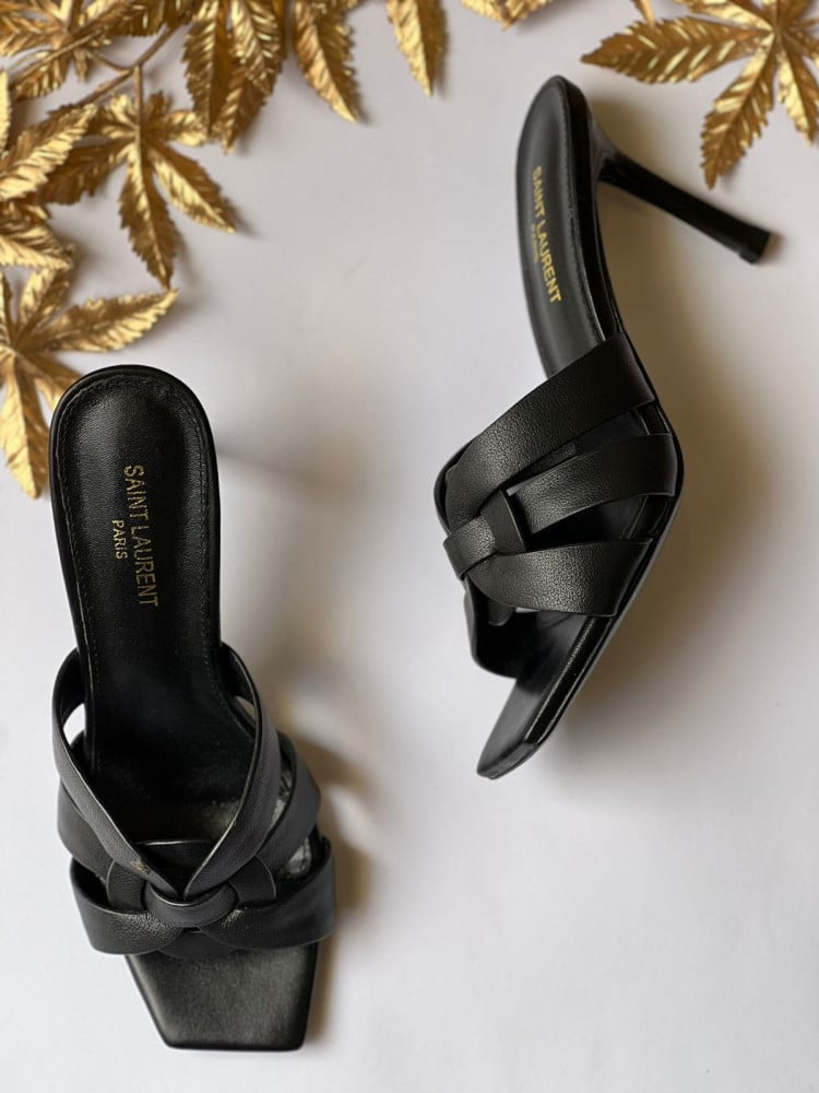 صندل جلدي أسود كعب عالي سان لوران فخم مريح