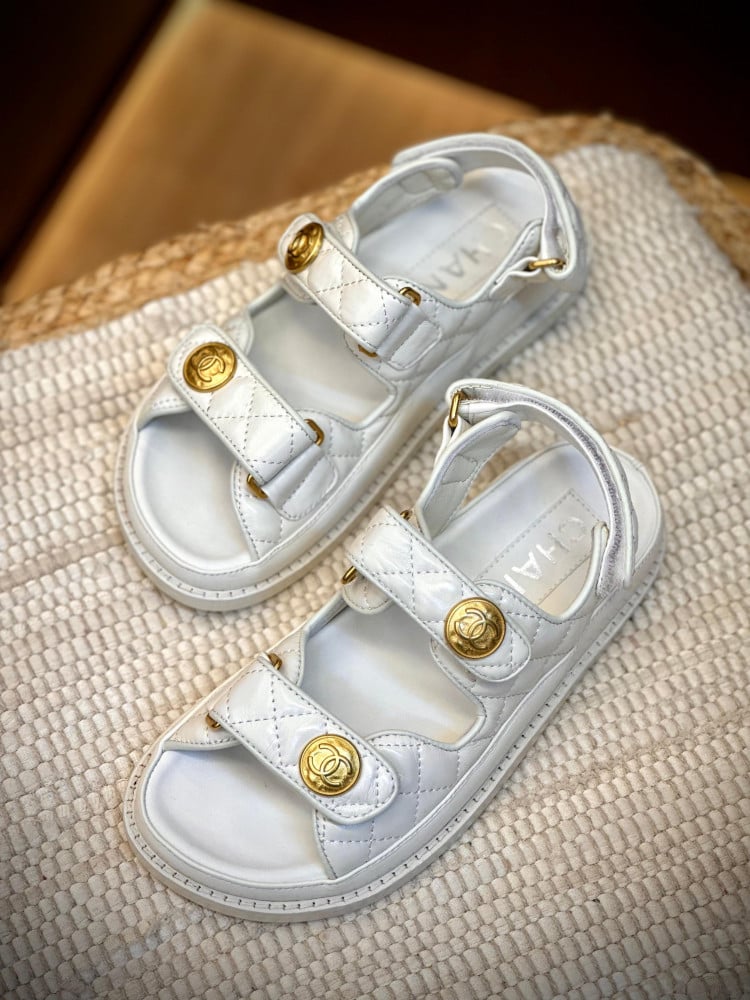 بلونه الأبيض النقي وشعار شانيل الذهبي الفاخر، يعكس هذا الصندل الفخامة والأناقة بأبهى صورها.