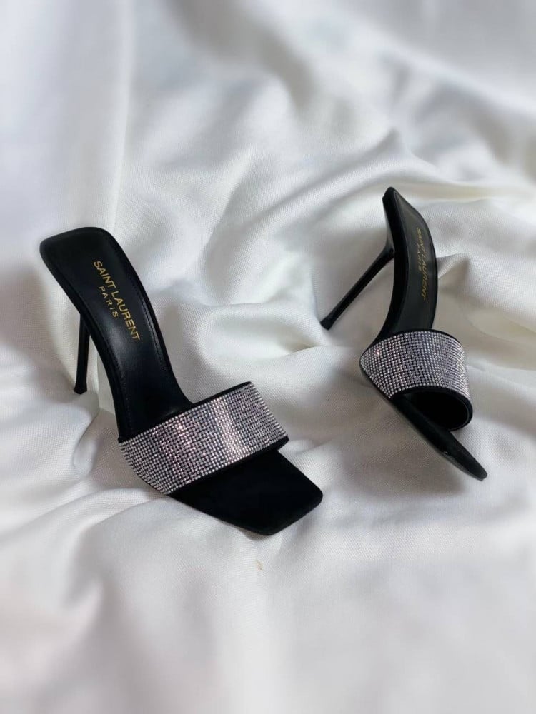 إطلالة ساحرة وأنيقة مع حذاء إيف سان لوران باللون الأسود، جلد ستراس لامع ويتميز بكعب عالي ونعل أسود.