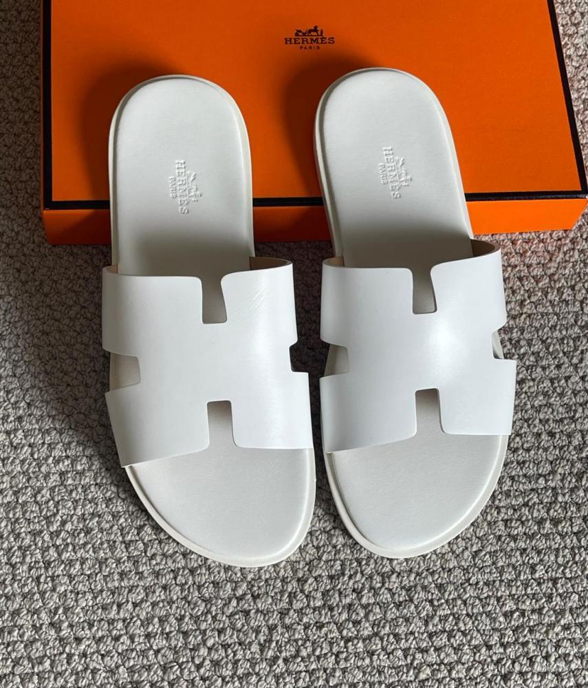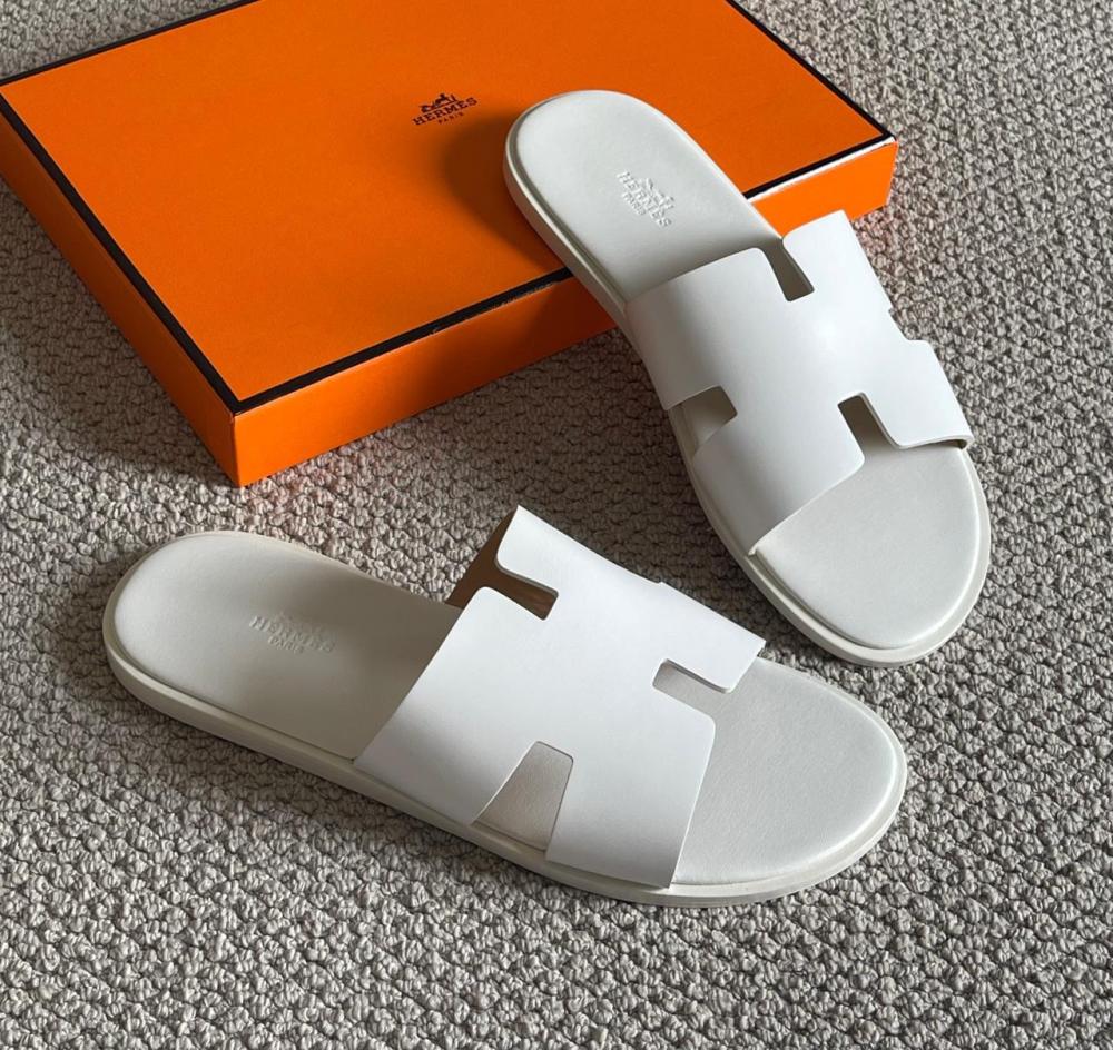 استمتع بالأناقة والراحة مع صندل هيرميس الرجالي الفلات باللون الأبيض، المصمم خصيصًا للرجل العصري الذي يقدّر التفاصيل الدقيقة والجودة العالية.