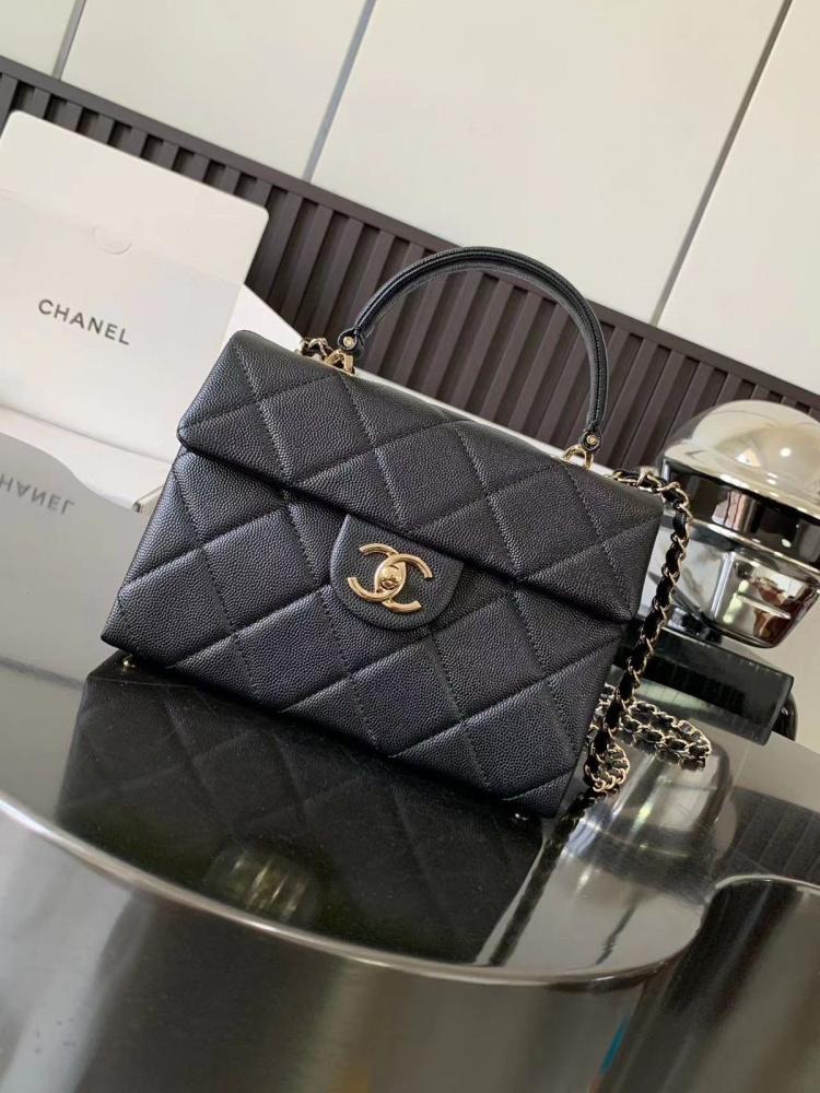 احصلي على لمسة من الأناقة والفخامة مع حقيبة يد راقية من شانيل بحجم 21 سم، باللون الأسود مع تفاصيل ذهبية.