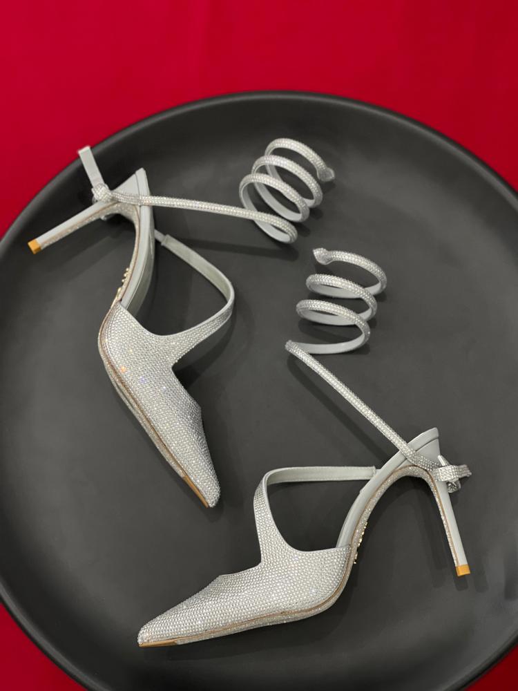 تألقي بإطلالة تخطف الأنظار مع صندل رينيه كوفيلا الفاخر، المصمم بساق ملتفة أنيقة تضفي لمسة من الرقي والأنوثة. يتميز بتزيين كامل بكريستالات الستراس اللامعة، مما يجعله الخيار المثالي للسهرات والمناسبات الخاصة. اللون الفضي اللامع يضفي لمسة من الفخامة تناسب كل إطلالة راقية.