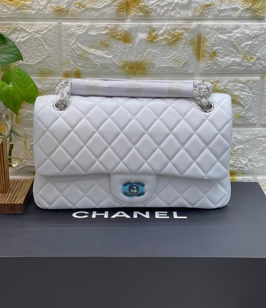 حقيبة بقلاب متوسطة الحجم من شانيل باللون الأبيض مع سلسلة هي قطعة أنيقة وعصرية تعكس روح الأناقة والفخامة التي تميز علامة شانيل.