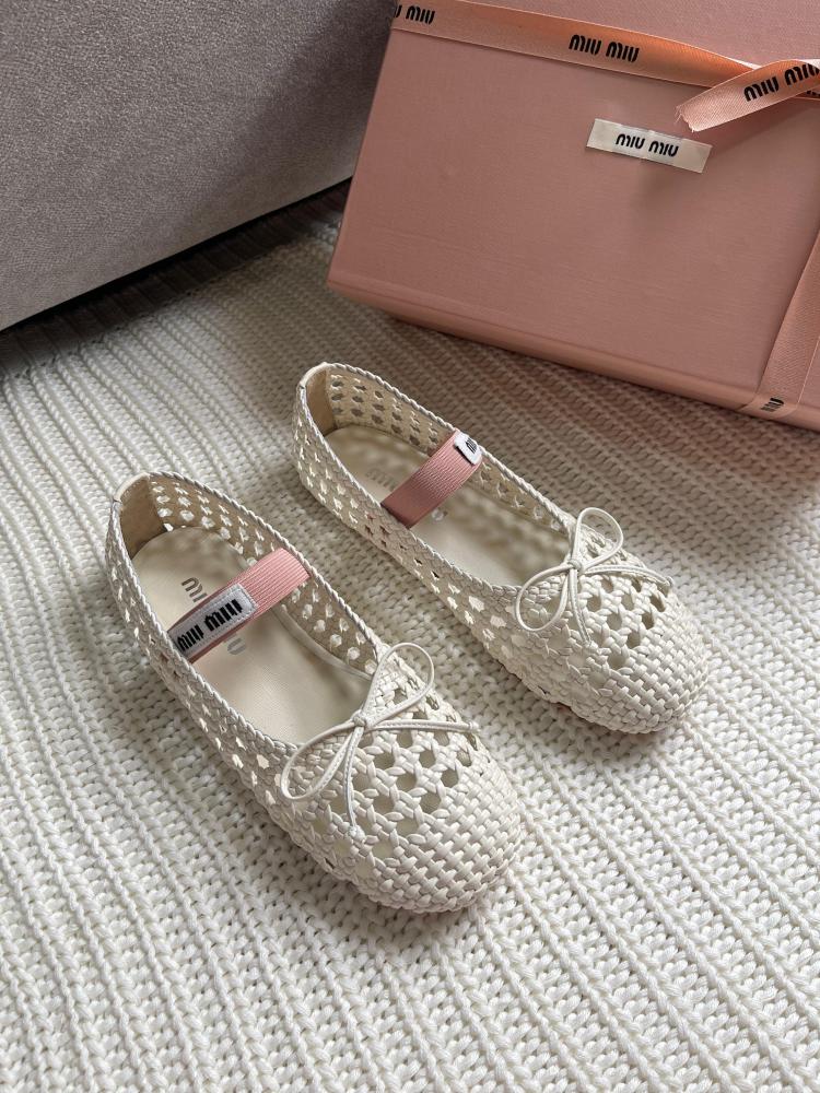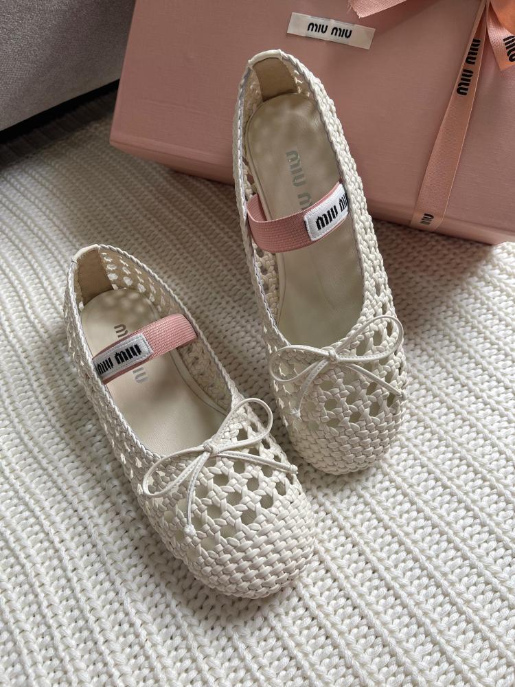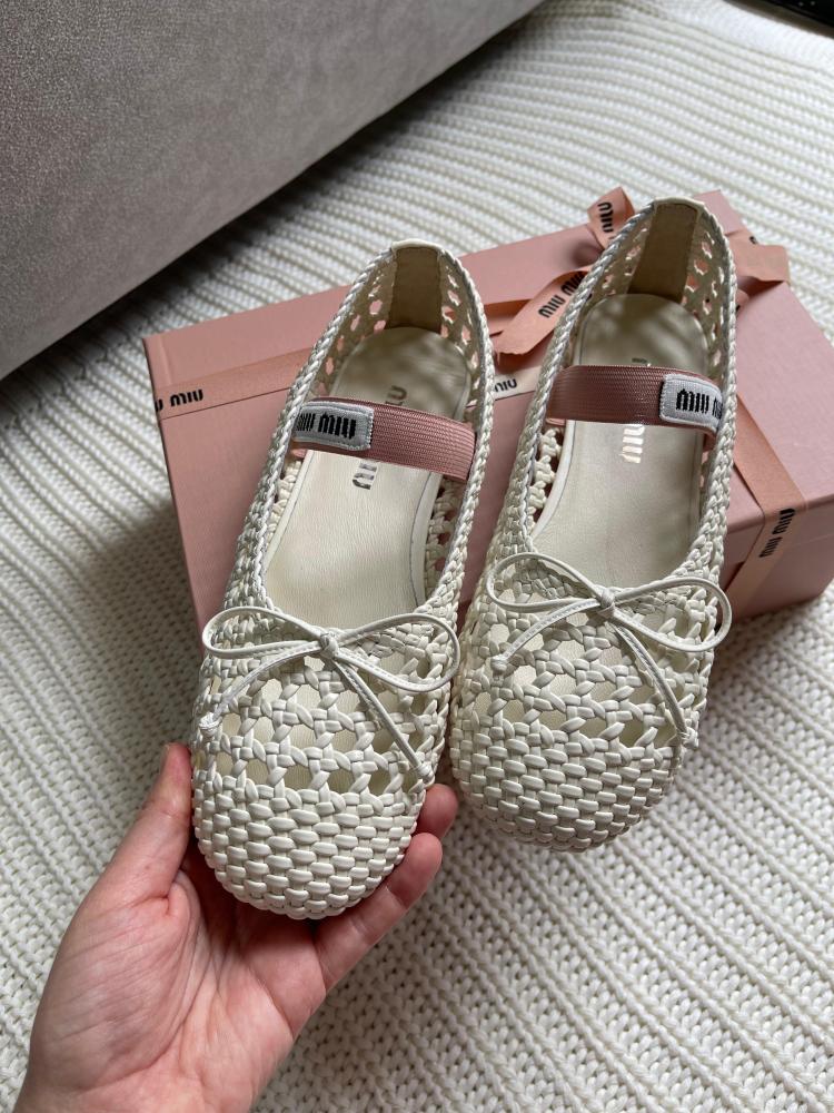 باليرينا Miu Miu بنمط مفرع ومزينة بعقدة باللون الأبيض، تصميم يجمع بين الأناقة الكلاسيكية واللمسة العصرية، لتضفي لمسة أنثوية راقية على إطلالتك اليومية أو الرسمية.