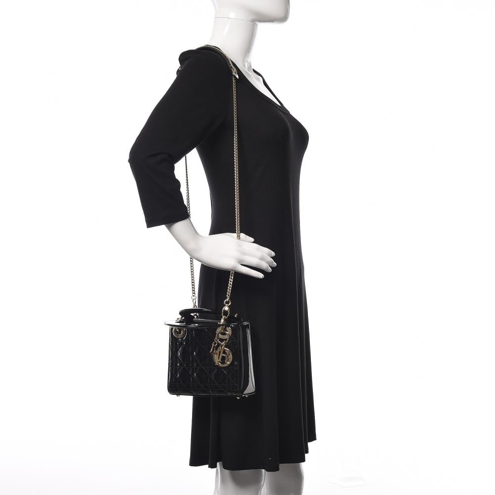 شنطة ليدي ديور ميني كاناج الأنيقة باللون الأسود اللامع هي رمز للفخامة والجاذبية الراقية.
